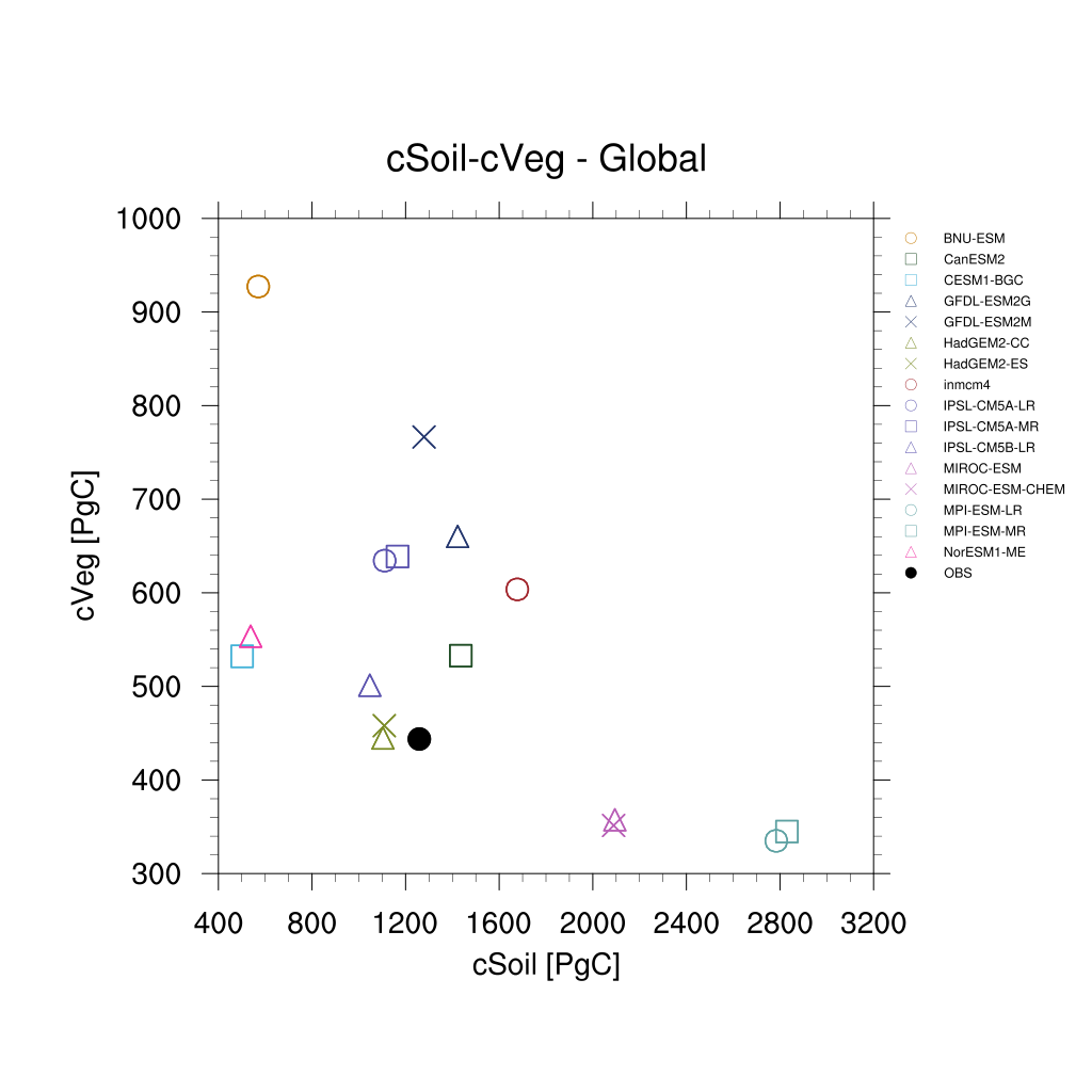 Fig. 345 Scatterplot for vegetation carbon content (cVeg) and soil carbon content (cSoil) over the period 1986-2005. Similar to Anav et al. (2013), Figure 12.#