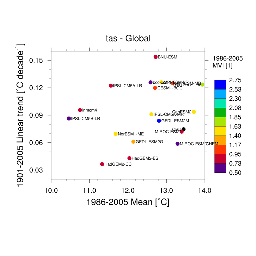 Fig. 344 Scatterplot for multiyear average of 2m surface temperature (TAS) in x axis, its linear trend in y axis, and MVI. Similar to Anav et al. (2013) Figure 1 (bottom).#