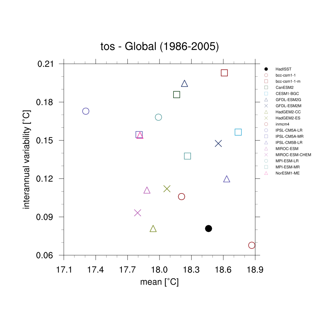 Fig. 343 Scatterplot for interannual variability and mean of global sea surface temperature (TOS) over the period 1986-2005.#