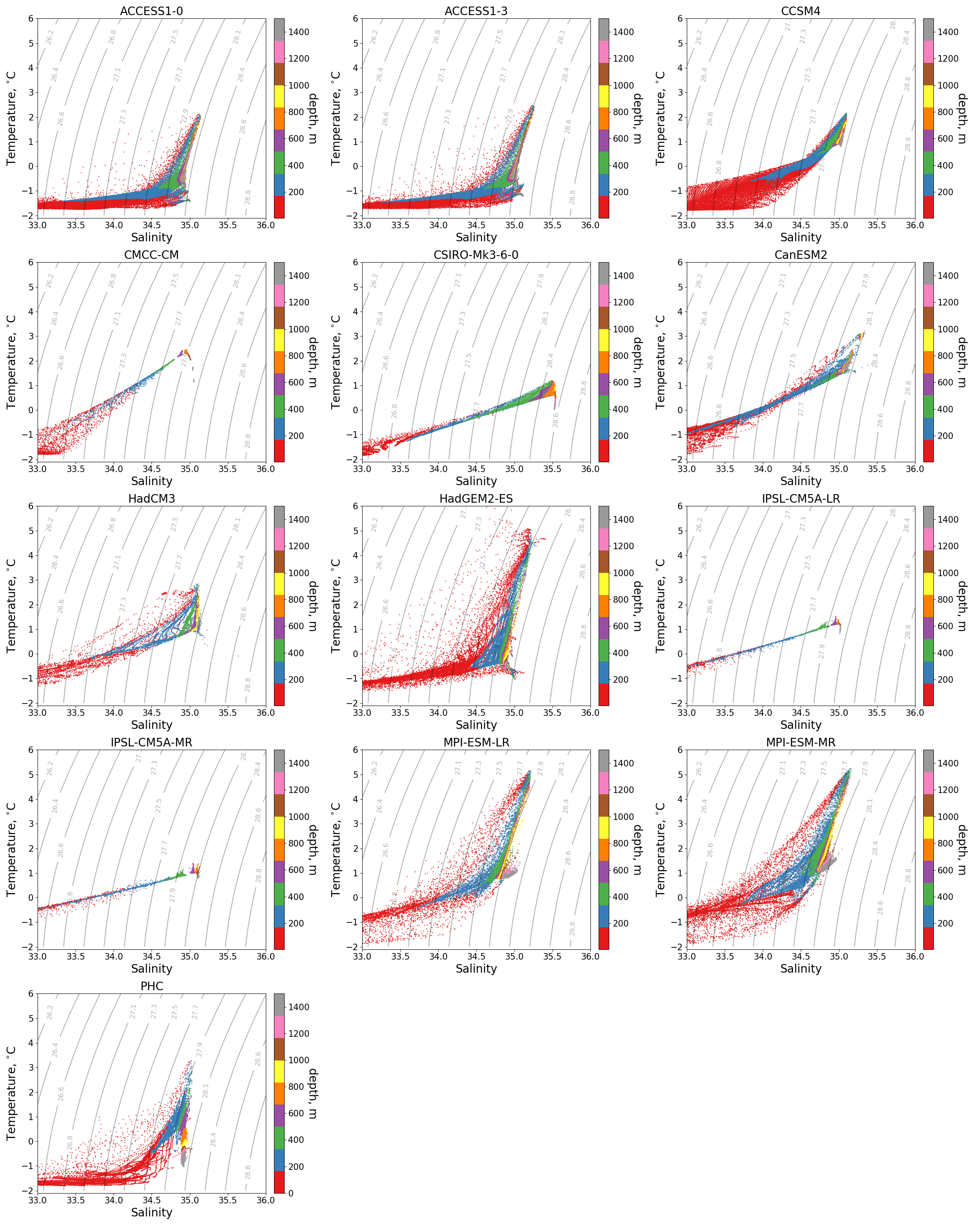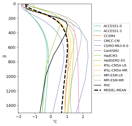 Fig. 354 Mean (1970-2005) vertical potential temperature distribution in the Eurasian basin for participating CMIP5 coupled ocean models, PHC3 climatology (dotted red line) and multi-model mean (dotted black line).#