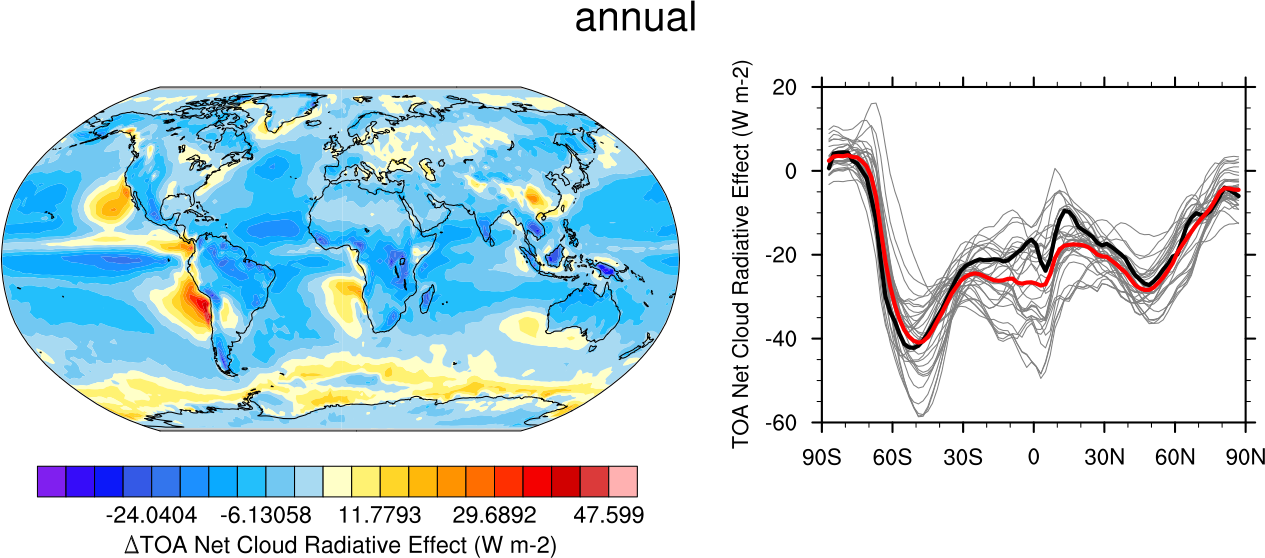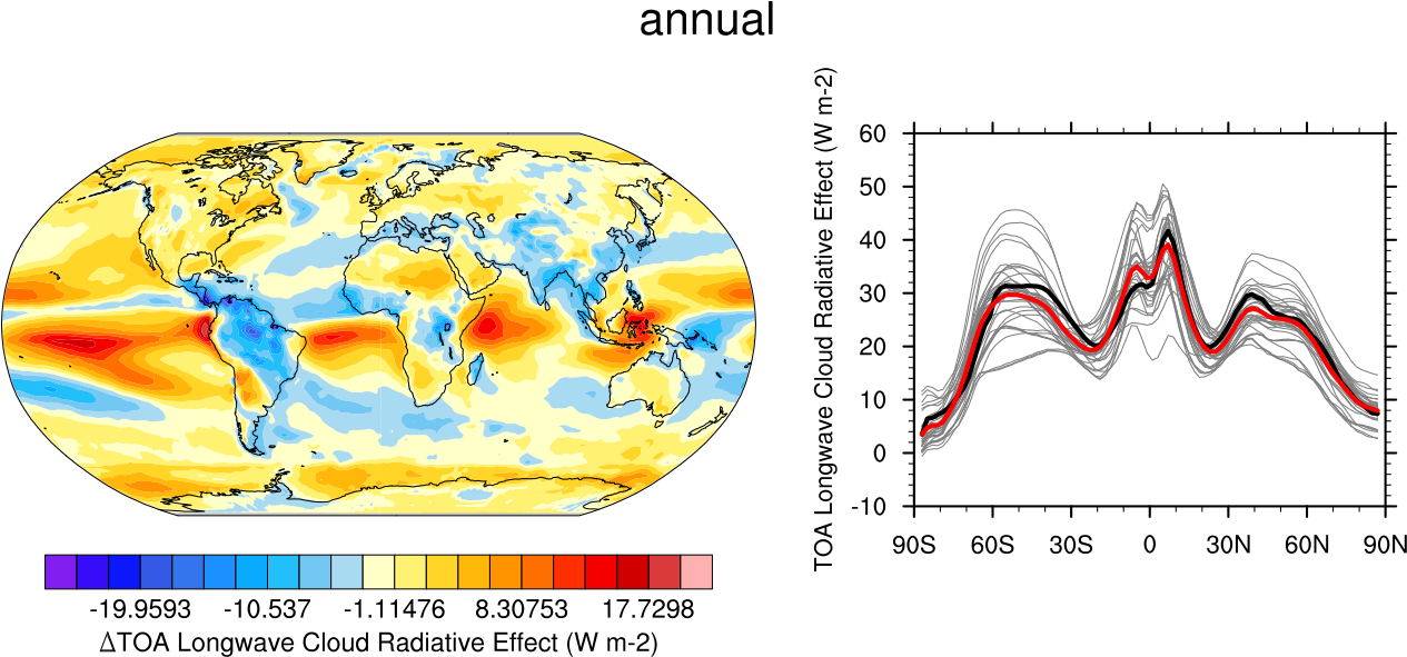 recipe_clouds_ipcc.yml computes multi-model mean bias and zonal means of the clouds radiative effect (shortwave, longwave and net). Similar to IPCC AR5 (ch. 9) fig. 9.5 (Flato et al., 2013).