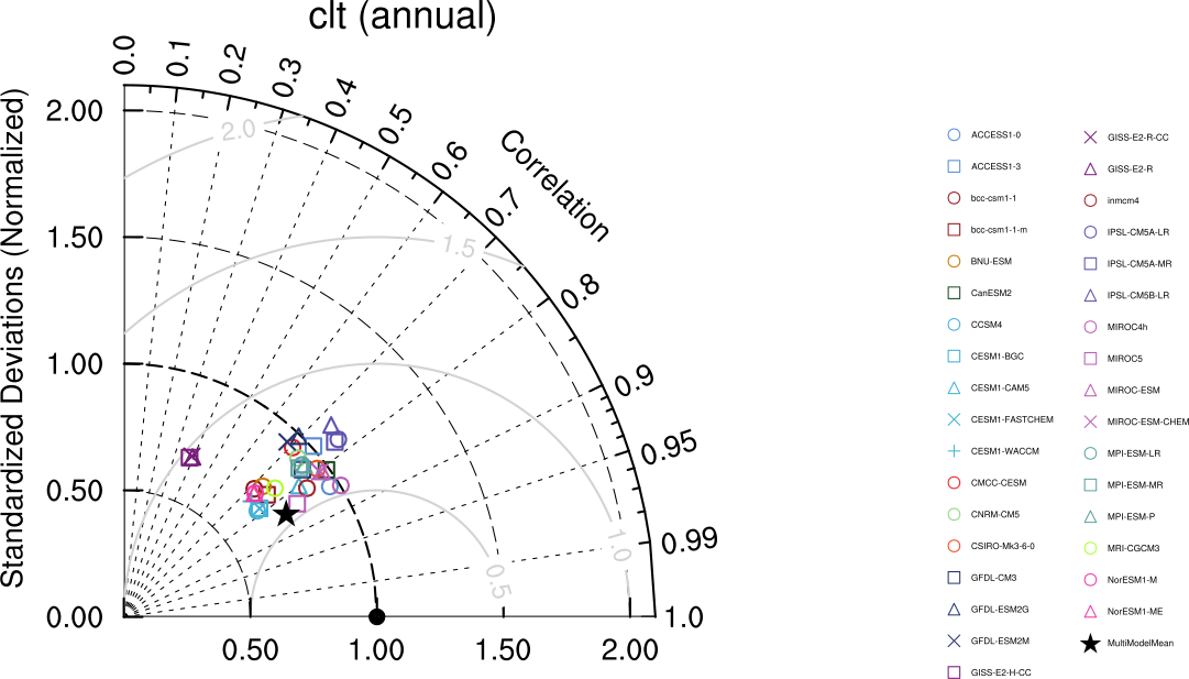 Fig. 142 Taylor diagram showing the 20-yr annual average performance of CMIP5 models for total cloud fraction as compared to MODIS satellite observations. Produced with recipe_lauer13jclim.yml (diagnostic script clouds_taylor.ncl).#