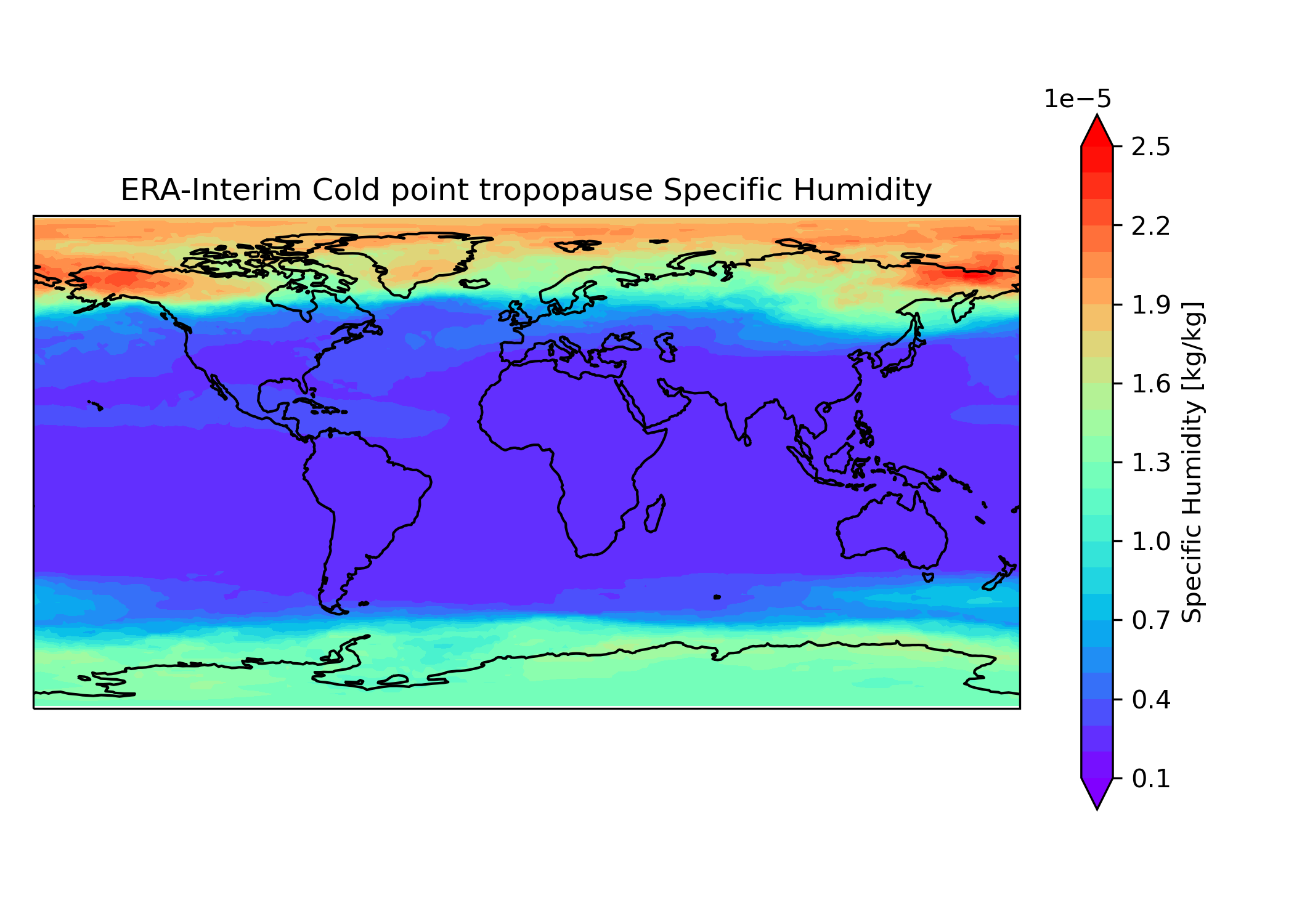 The diagnostic diag_tropopause.py plots given variable at cold point tropopause height, here Specific Humidity (hus) is used. This will be calculated from the ESACCI water vapour data CDR-4, which are planed to consist of three-dimensional vertically resolved monthly mean water vapour data (in ppmv) with spatial resolution of 100 km, covering the troposphere and lower stratosphere. The envisaged coverage is 2010-2014. The calculation of hus from water vapour in ppmv will be part of the cmorizer. Here, ERA-Interim data are used.