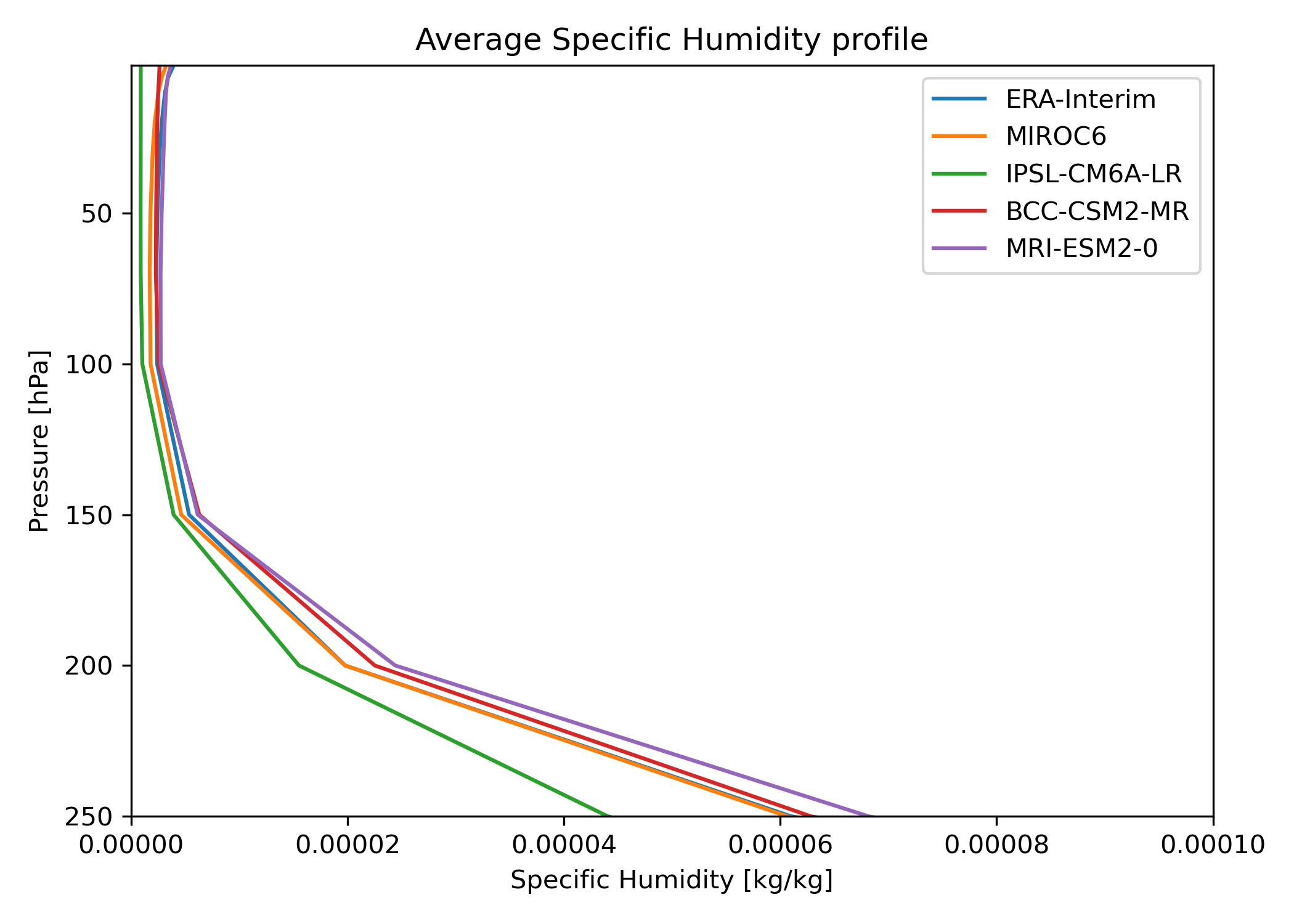 Fig. 153 Average Specific Humidity (hus) profile between 250 and 1 hPa from ERA-Interim and CMIP6 model data. The diagnostic averages the complete time series, here 1985-2014.#