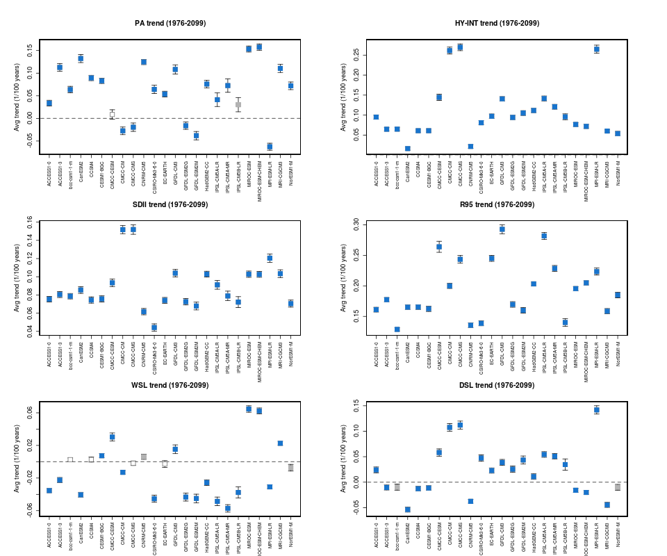 Fig. 181 Multi-model trend coefficients over selected indices for CMIP5 models in the RCP8.5 2006-2099 projection, normalized to the 1976-2005 historical period.#