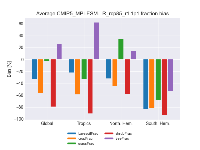 The diagnostic computes the accumulated and fractional extent of major land cover classes, namely bare soil, crops, grasses, shrubs and trees. The numbers are compiled for the whole land surface as well as separated into Tropics, northern Extratropics and southern Extratropics. The cover fractions are compared to ESA-CCI land cover data.