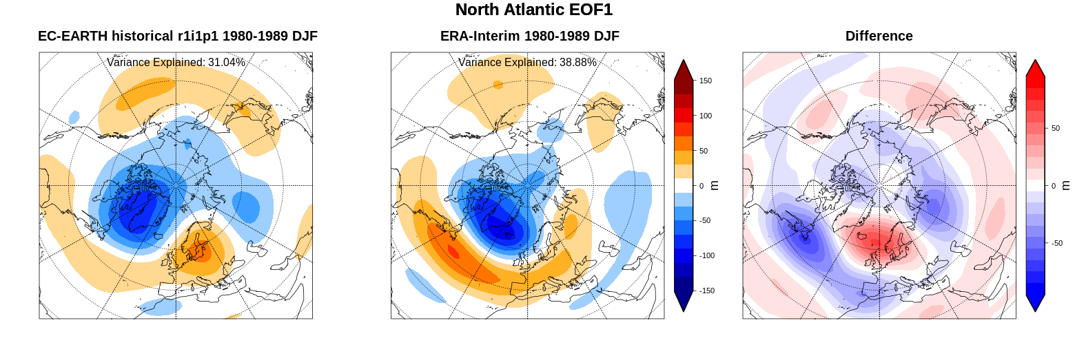Fig. 139 North Atlantic Oscillation for a CMIP5 EC-Earth historical run (DJF 1980-1989) compared to ERA-Interim, shown as the linear regression of the monthly Z500 against the first Principal Component (PC1) of the North Atlantic region.#