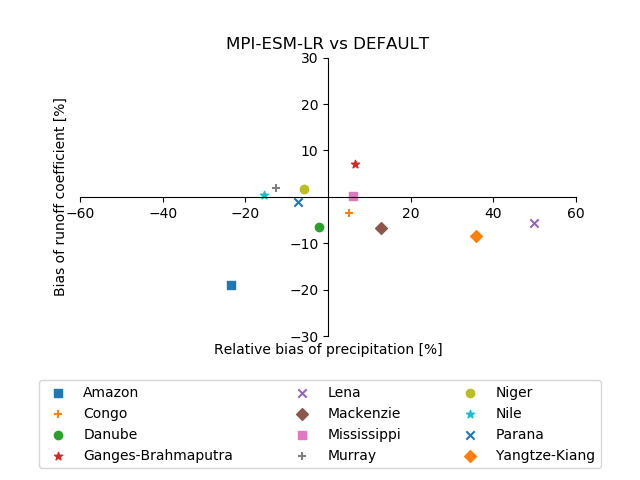 Fig. 349 Biases in runoff coefficient (runoff/precipitation) and precipitation for major catchments of the globe. The MPI-ESM-LR historical simulation (1970-2000) is used as an example.#