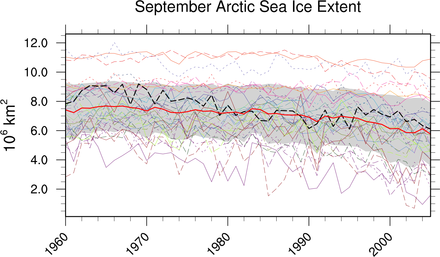 Fig. 402 Time series of total sea ice area and extent (accumulated) for the Arctic in September including multi-model mean and standard deviation (similar to IPCC AR5 Chapter 9, Fig. 9.24a). [seaice_tsline.ncl]#