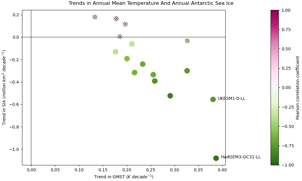 Fig. 408 Plot of the trend of annually averaged southern hemisphere sea ice area (millions of square kilometres) over time against the trend of annually and globally averaged air temperature near the surface (degrees Kelvin) over time. The values plotted are 10 times the annual trend, which was calculated using scipy.stats.linregress(), for consistency with the decadal values used in the published plot.#