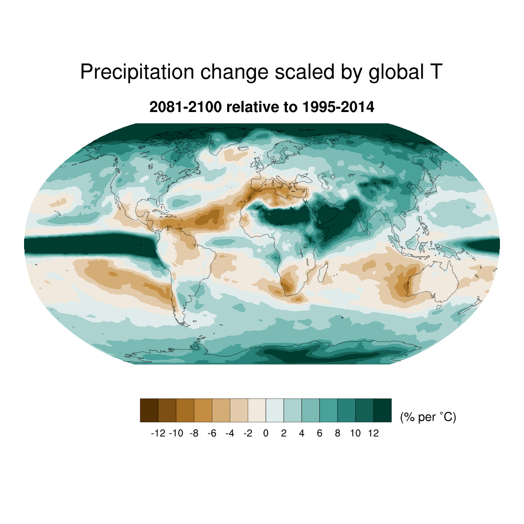 Fig. 275 Patterns of temperature (a) and percent precipitation change (b) normalized by global average temperature change (averaged across CMIP6 models and all Tier 1 plus SSP1-1.9 scenarios).#