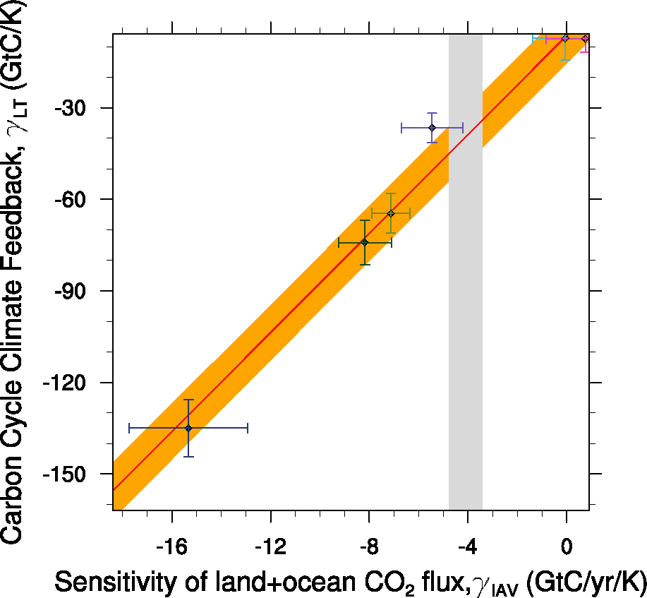 Fig. 252 Carbon cycle-climate feedback of tropical land carbon vs. the sensitivity of co2flux to interannual temperature variability in the tropics (30S to 30N). The red line shows the linear best fit of the regression together with the prediction error (orange shading) and the gray shading shows the observed range.#