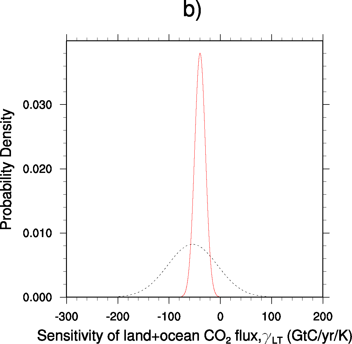 Fig. 253 Probability Density Functions for the pure CMIP5 ensemble (black dashed) and after applying the observed constraint to the models (red solid)#